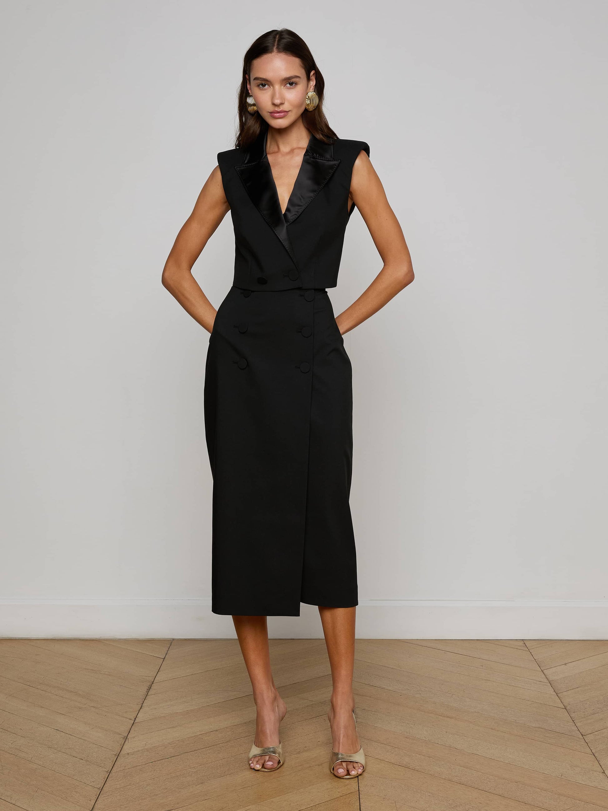 The classic vest made impeccably modern. Strong shoulders and a cropped fit create a striking silhouette while a matte satin lapel adds dimension to this sleek, feminine take on a suiting essential. Pair the Hollis with trousers and a sky-high heel for an unexpected night out look or pair it with the Febe tuxedo skirt for a fresh approach to the power suit.