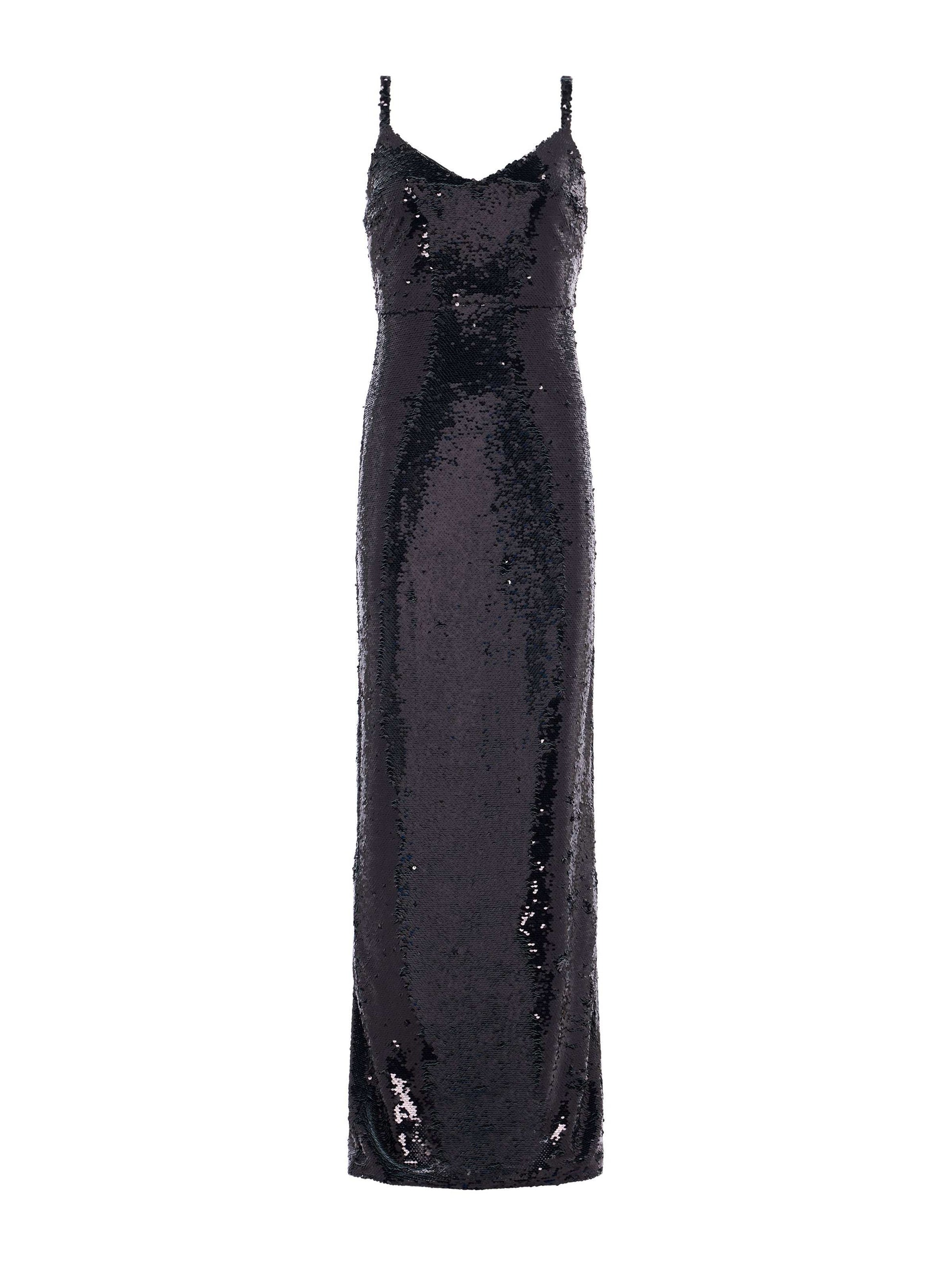Make an entrance with the Karma. A sexy, structured bodice meets bold black sequins for a body-skimming statement.