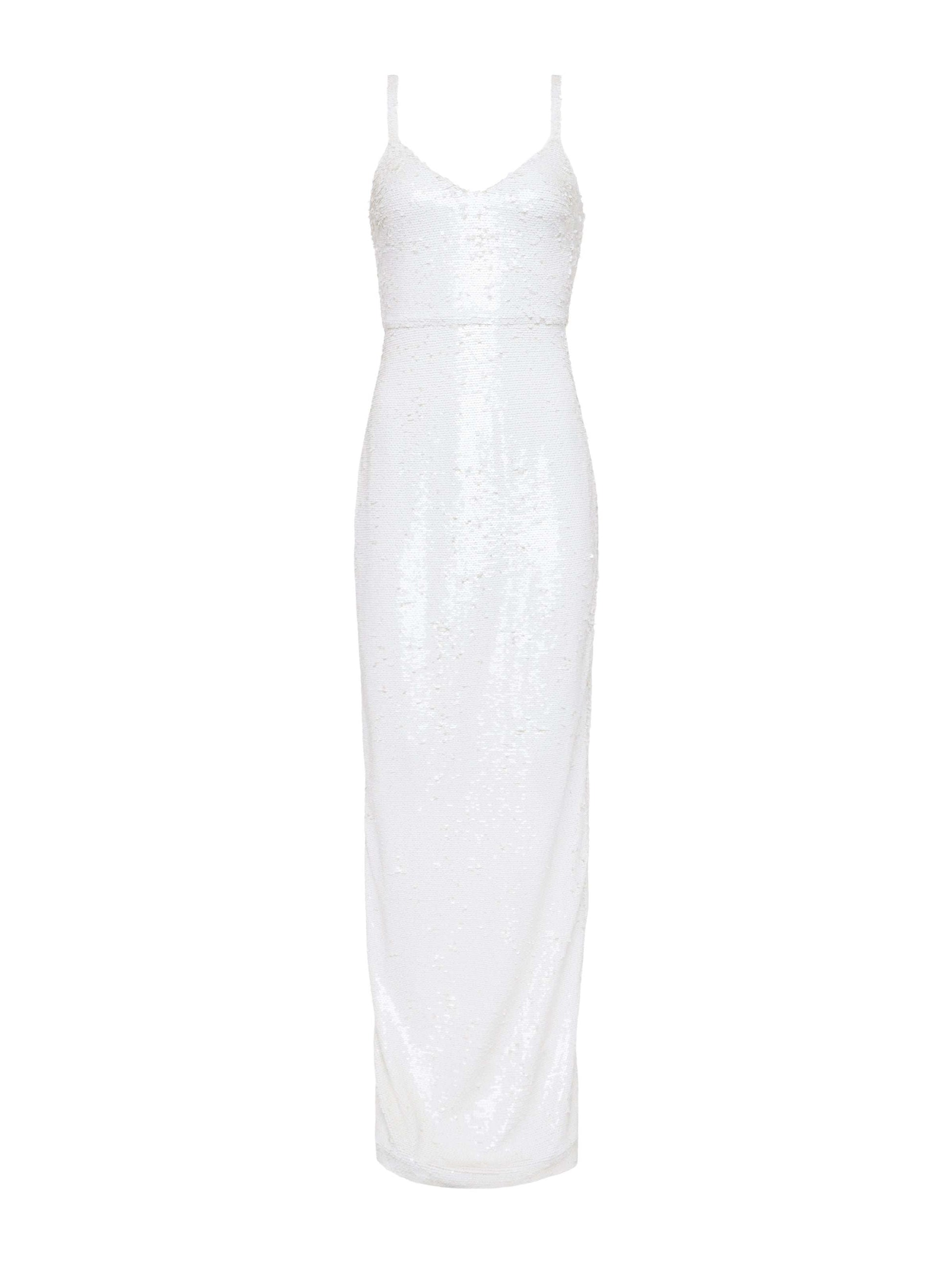 Make an entrance with the Karma. A sexy, structured bodice meets light-catching white sequins for a body-skimming statement in this sophisticated stunner made for special moments.