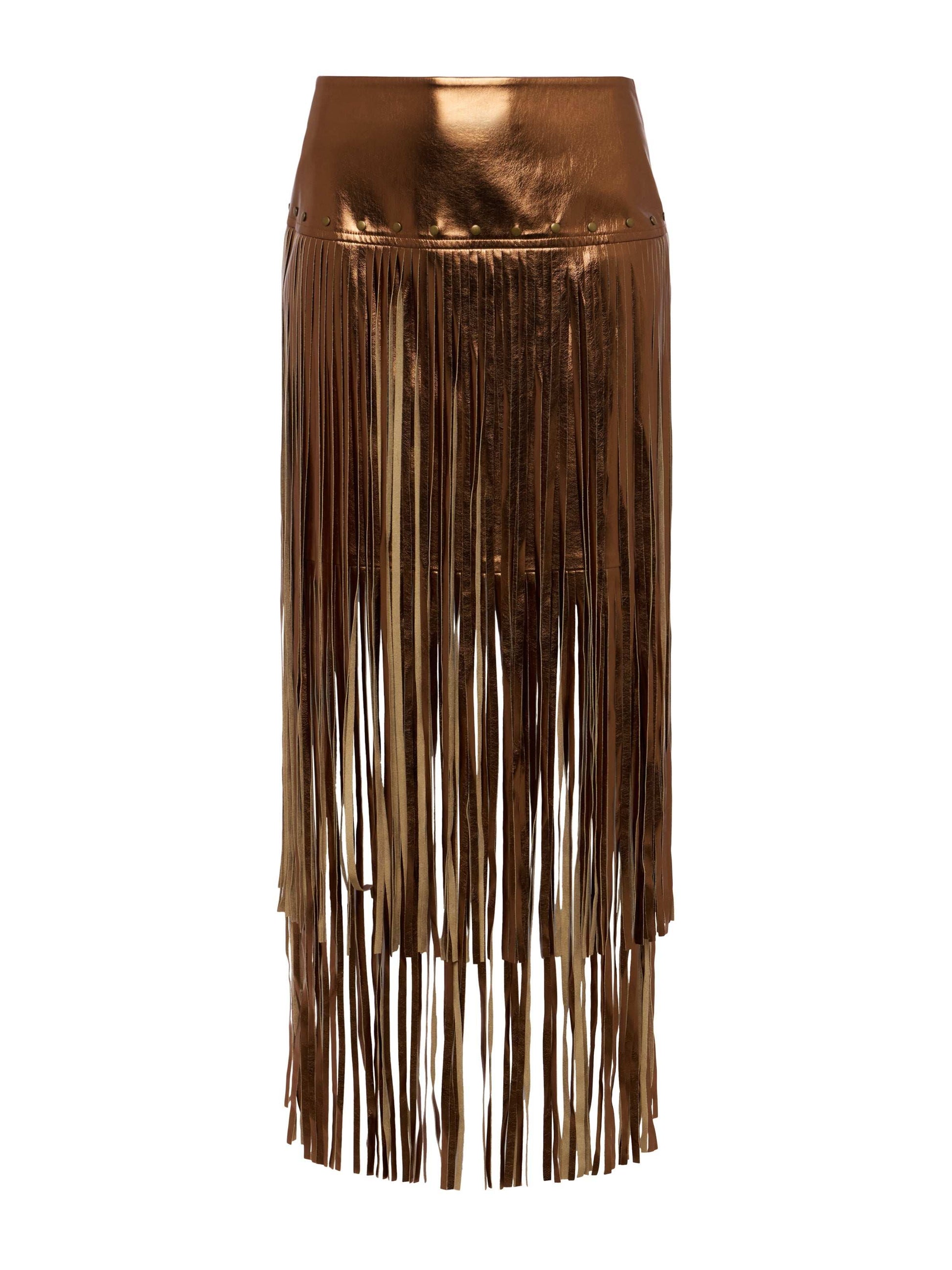 The Karolina statement skirt turns heads with every step¡ªcrafted in bronze vegan leather, it features tiered fringe for dramatic movement and studded detailing for extra edge.