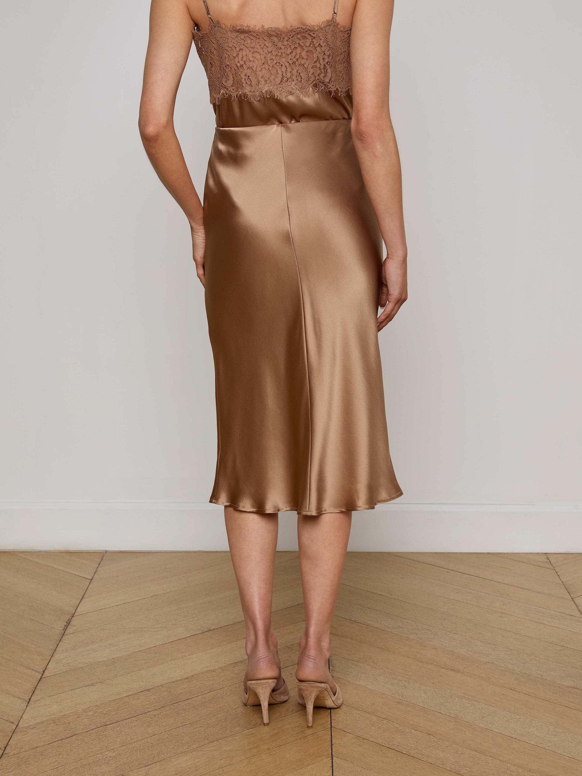 The perfect silk skirt does exist. The elegantly understated Perin skirt is bias cut from silk charmeuse, fits through the wait and hips and drapes to a subtle flared hem. Now in cappuccino, the Perin is infinitely versatile, pairing with equally well with tees and blouses.
